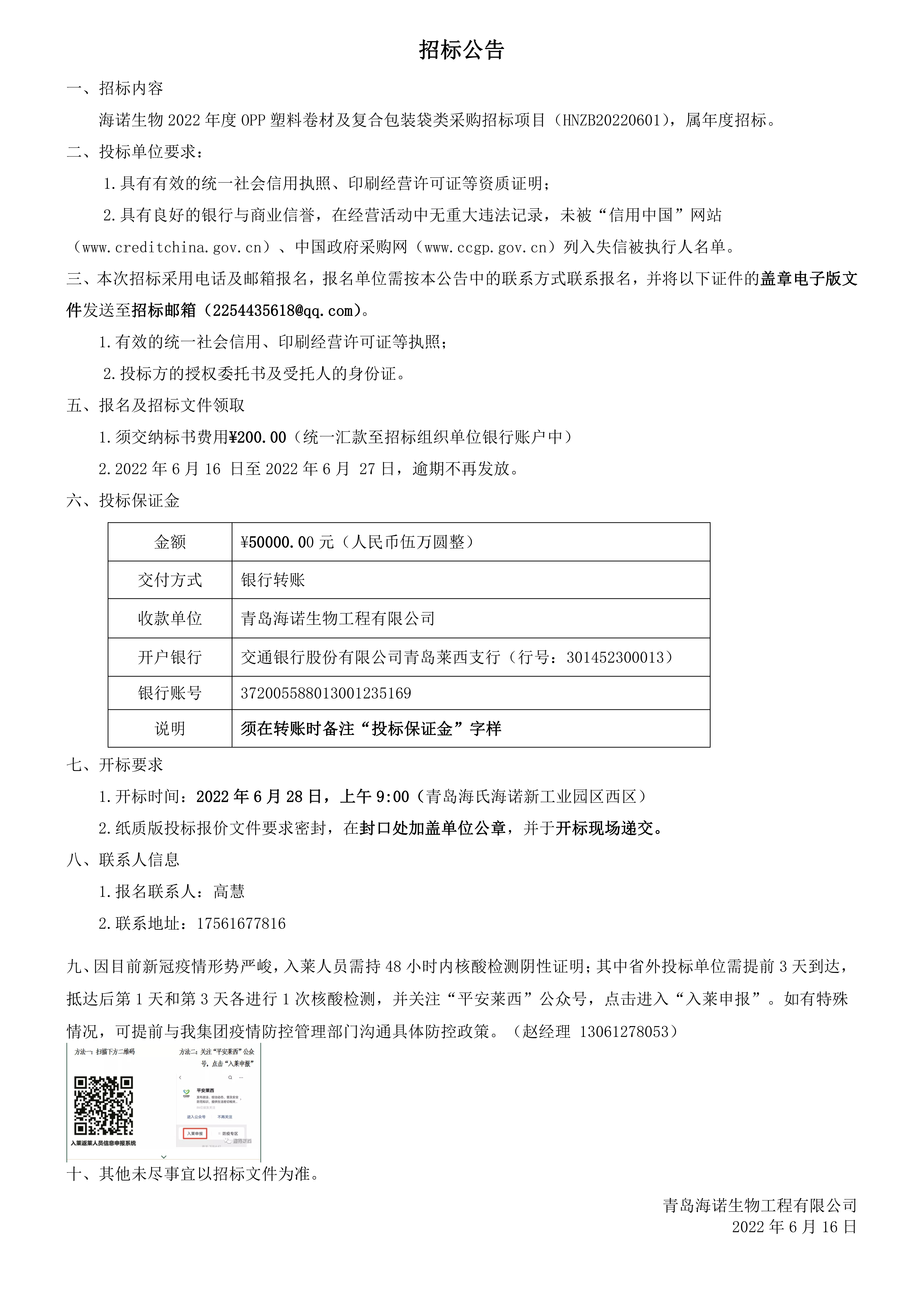 2022.06.22海諾生物2022年度OPP塑料卷材及復(fù)合包裝袋類采購(gòu)招標(biāo)正式開始,屆時(shí)我們將秉承公正、公平、公開、透明的招標(biāo)原則,期待優(yōu)秀供應(yīng)商的廣泛參與。具體招標(biāo)細(xì)節(jié)如下:
