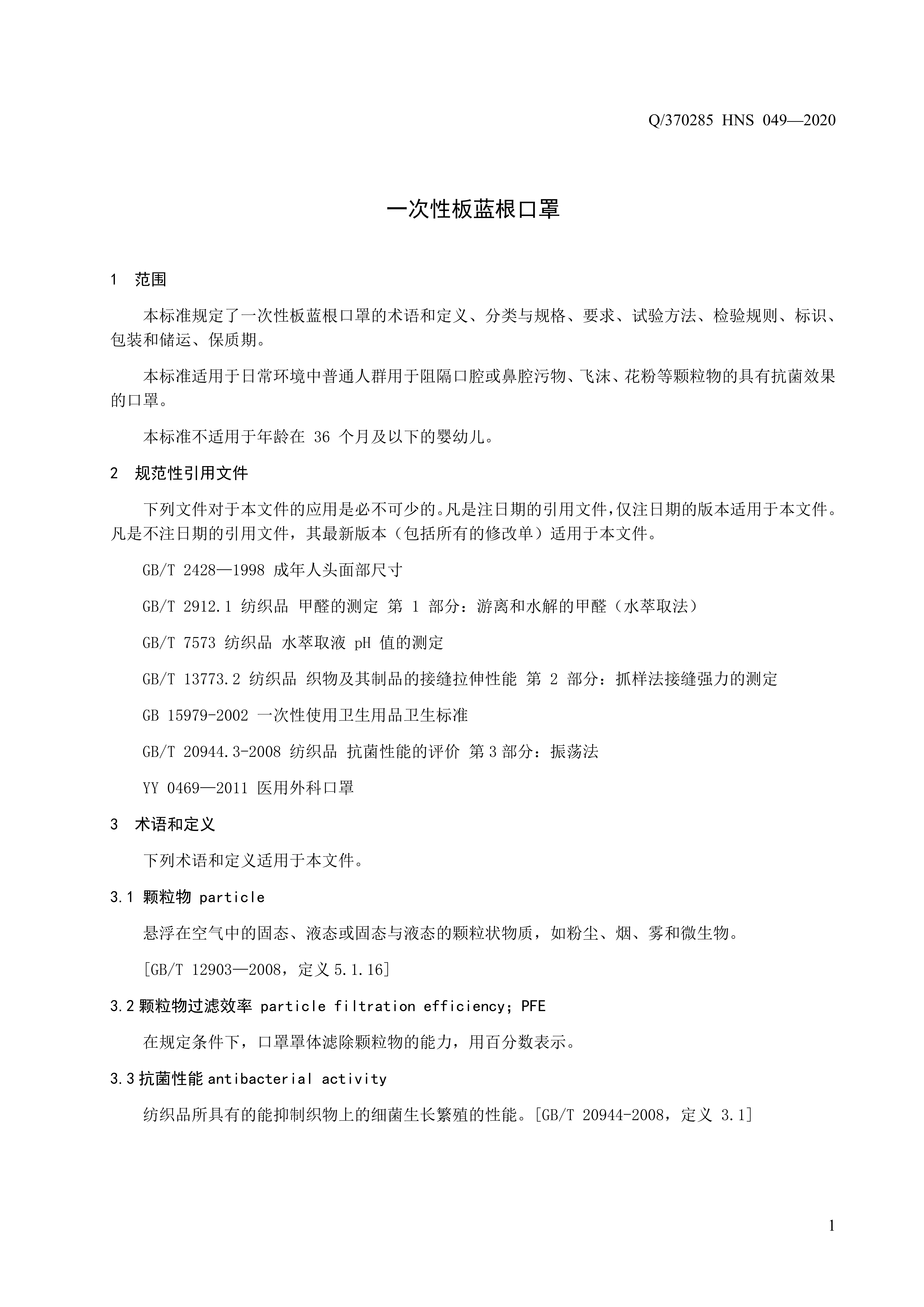 青島海諾生物工程有限公司企業標準 — 一次性板藍根口罩