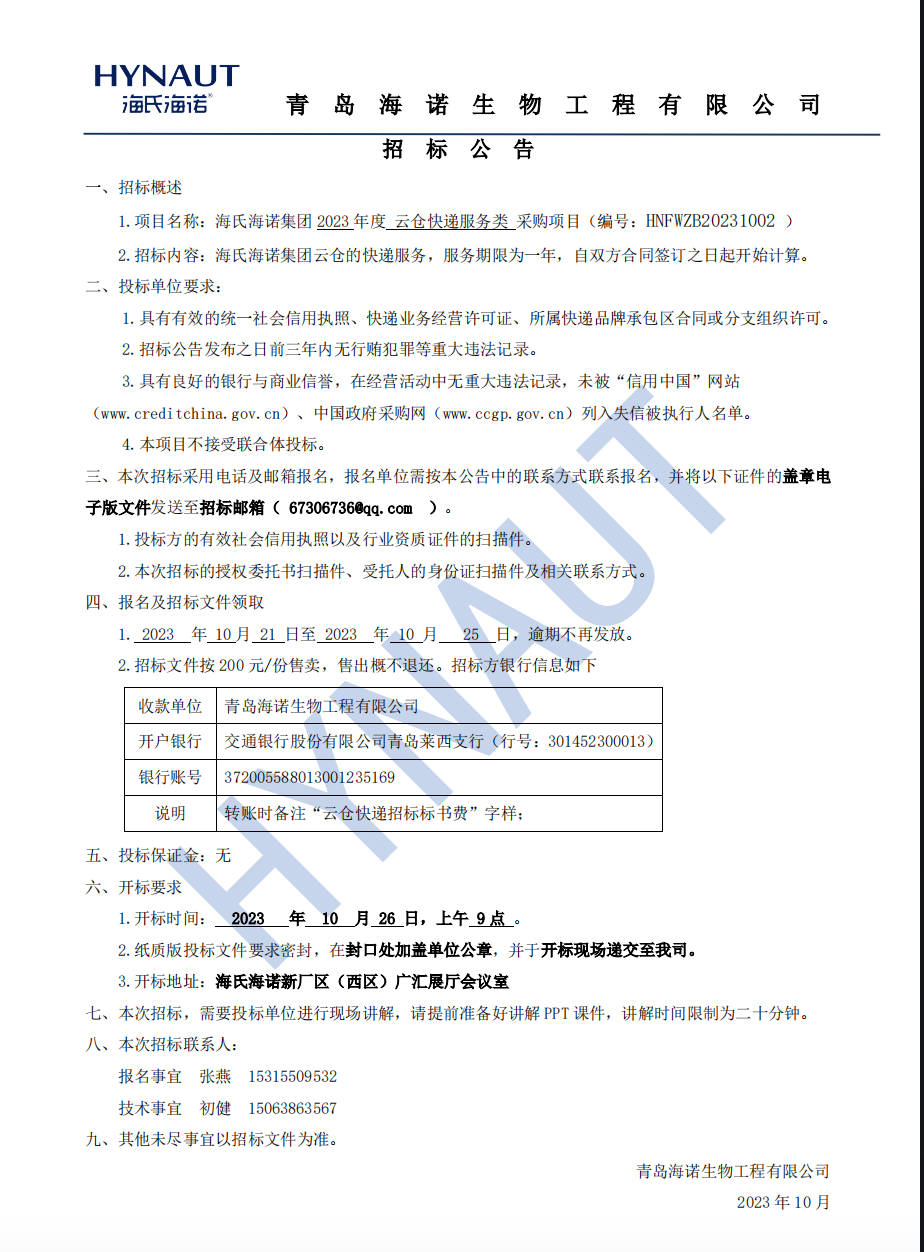 《海氏海諾集團2023云倉快遞服務類采購項目招標公告》